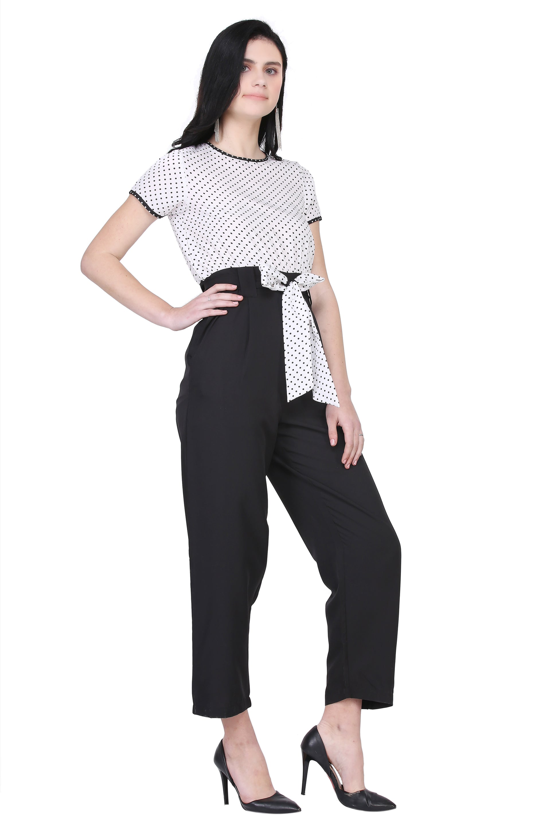 Crafted from durable polyester fabric, the Polka Dot Pouch Pocket Jumpsuit combines comfort with effortless style. Its breathable material ensures all-day wearability, while the pouch pockets add practical convenience. The classic polka dot pattern lends a timeless, sophisticated look, making this jumpsuit a versatile addition to any expert wardrobe.