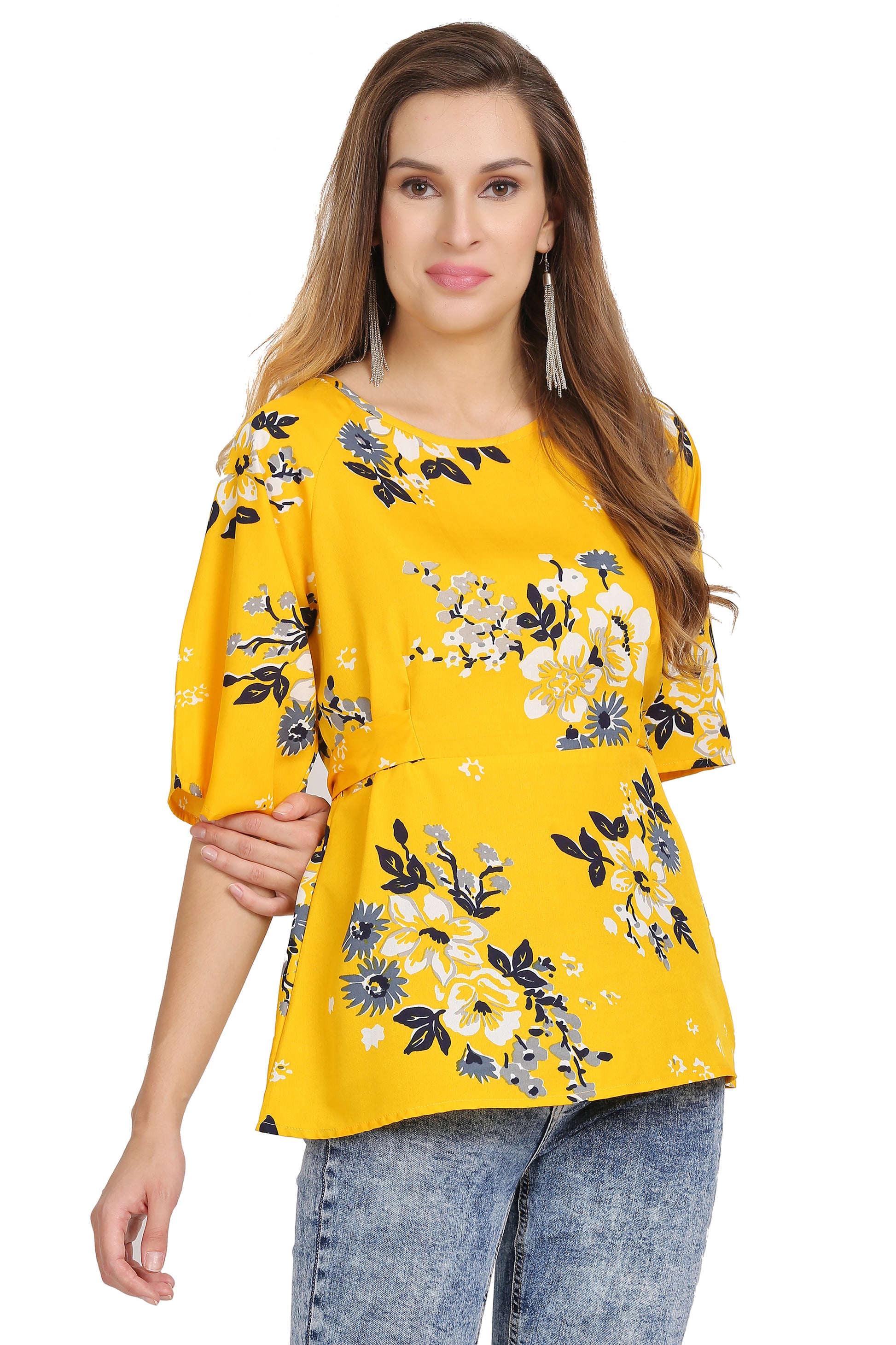 Bring a burst of sunshine to your wardrobe with our Golden Sunshine Floral Top. This cheerful and vibrant piece is designed to brighten your day and your look. Made from a lightweight, smooth polyester fabric, it drapes beautifully and feels comfortable all day long. The stunning golden-yellow background is adorned with a delicate and modern floral print in shades of white, gray, and black, creating a chic and eye-catching contrast. The top features a flattering tie-front detail that cinches at the waist, creating a beautiful silhouette that defines your figure. The short, flared sleeves add a touch of playful volume and movement. This is the perfect top for a casual day out or a stylish weekend brunch, promising to add a fresh and lively touch to any outfit.